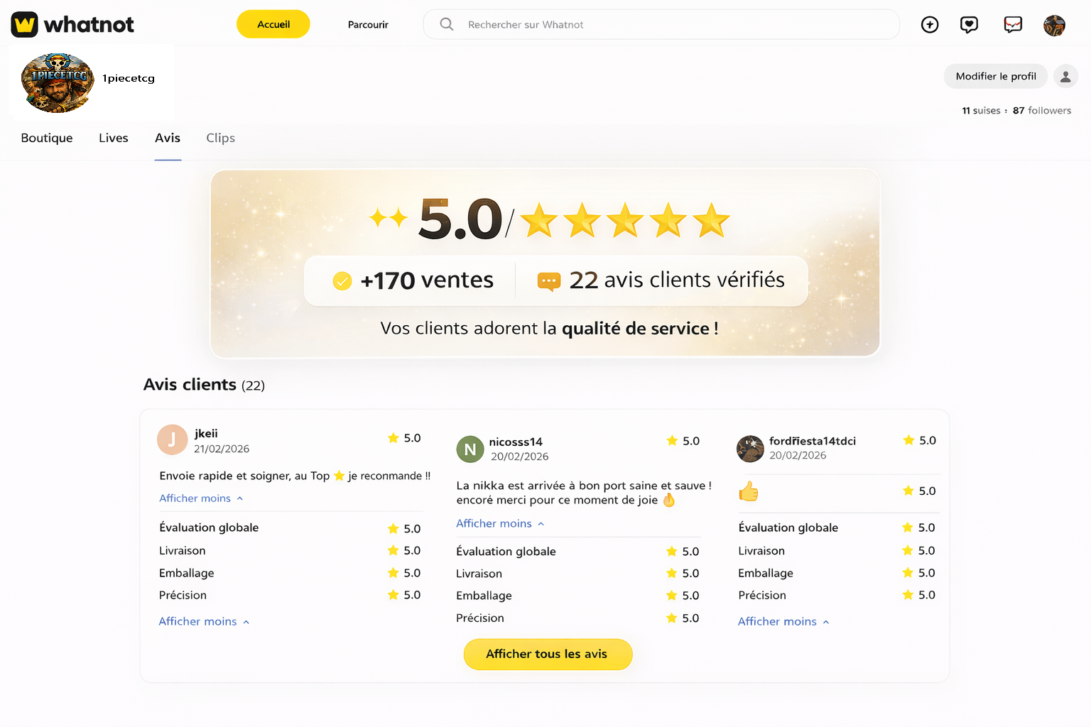 Avec une note moyenne de 5.0/5, plus de 170 ventes réussies et 22 avis clients vérifiés, notre boutique est reconnue pour son sérieux et sa qualité.
